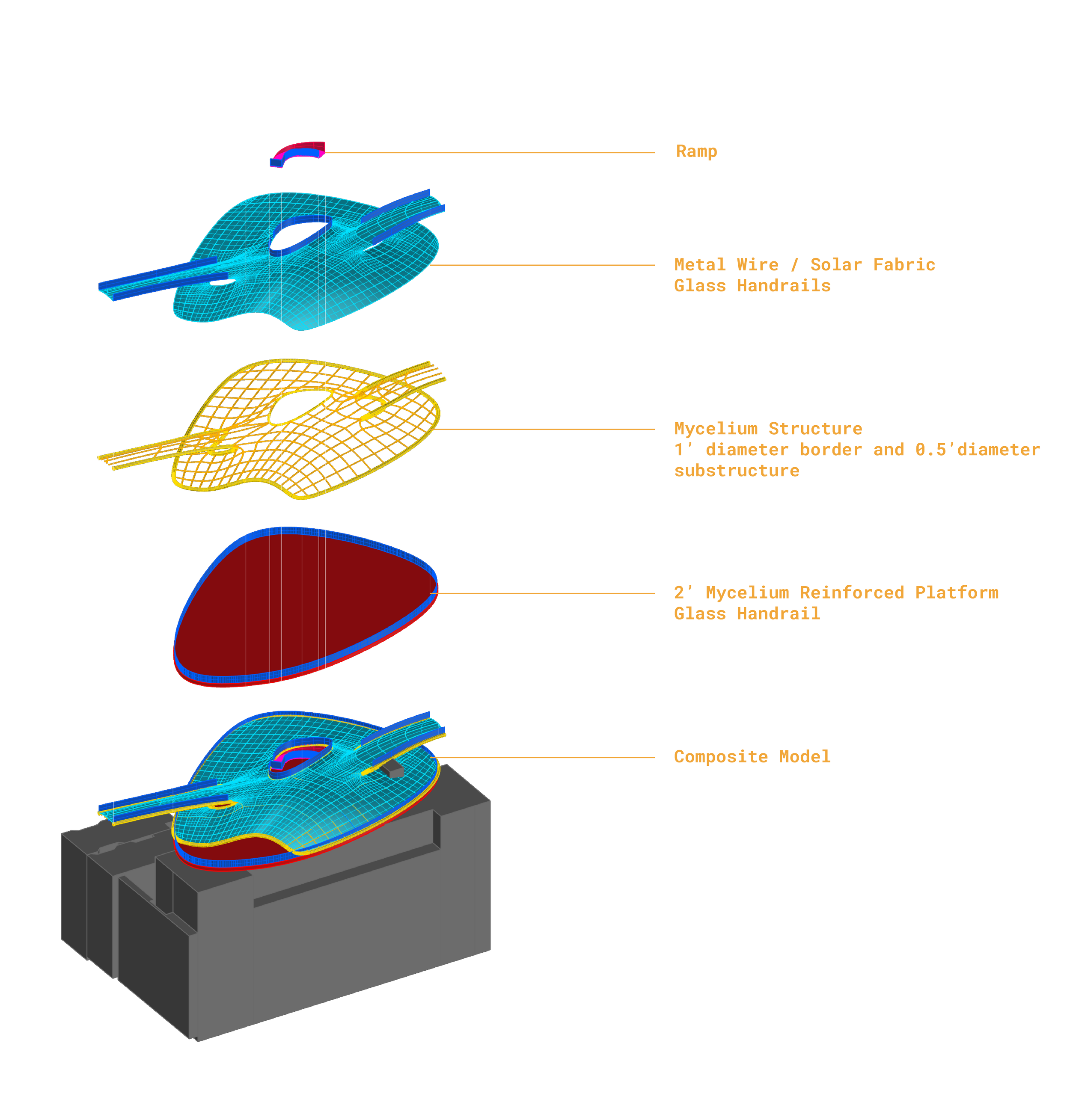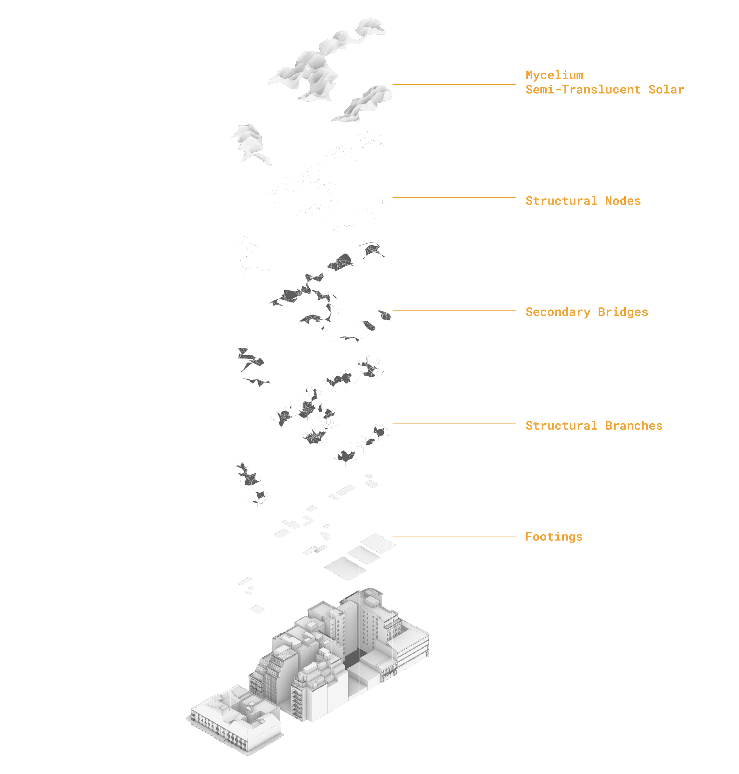 Archipelago is a project to transform and revitalize the rooftop space in Harlem, NYC. The project's tactic assembles those patches on the rooftop to prosper communal activities and cultures and return greenery space to the city. It is the modern version of Robert Moses' swimming pool and resistance to the environmental crisis - the urban heat island effect. Mycelium tunnels and arches form the main structure and connection system, which would experience growth, aging and death. The supportive nodes are calibrated parametrically, whereas the connection and ending of rooftop patches automatically generate by embedded code. In this way, the building's lifecycle would concur with Mycelium's growing and withering. The programmes are no longer preset by the architects but developed by human occupancy and situations: With more activities involved, opening spaces would be exploited, and with fewer human traces, bushes and natural creatures would come back as compensation for exploitation. The strong motive behind the act is to restrain the architects' power and urge them to step aside in humility after the accomplishment of building and let the user develop situations.