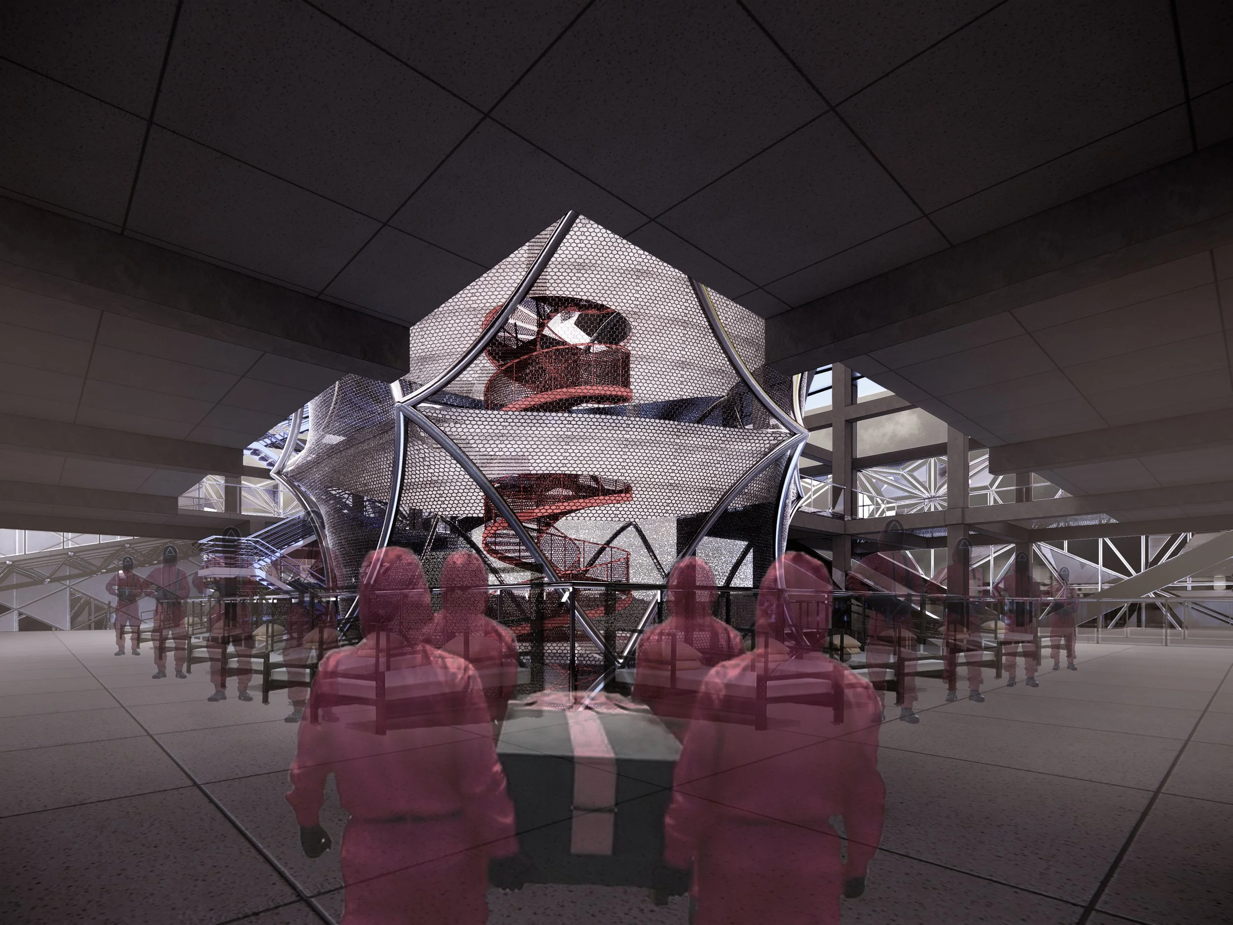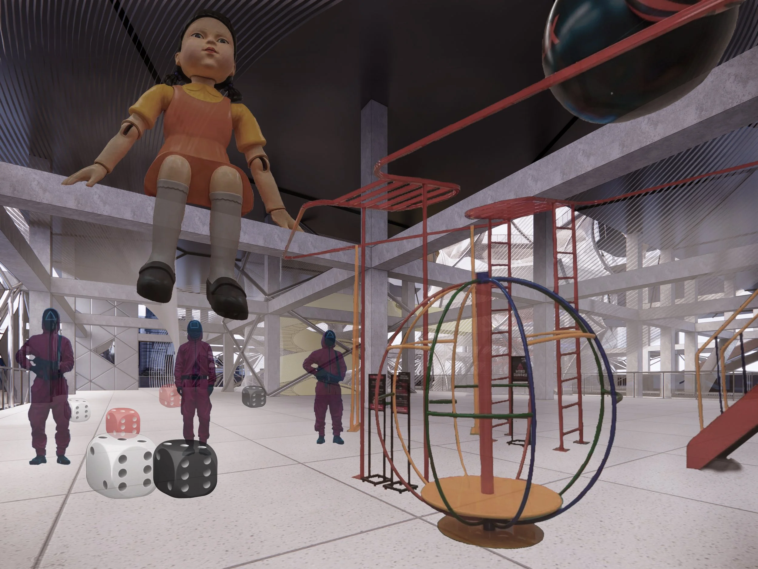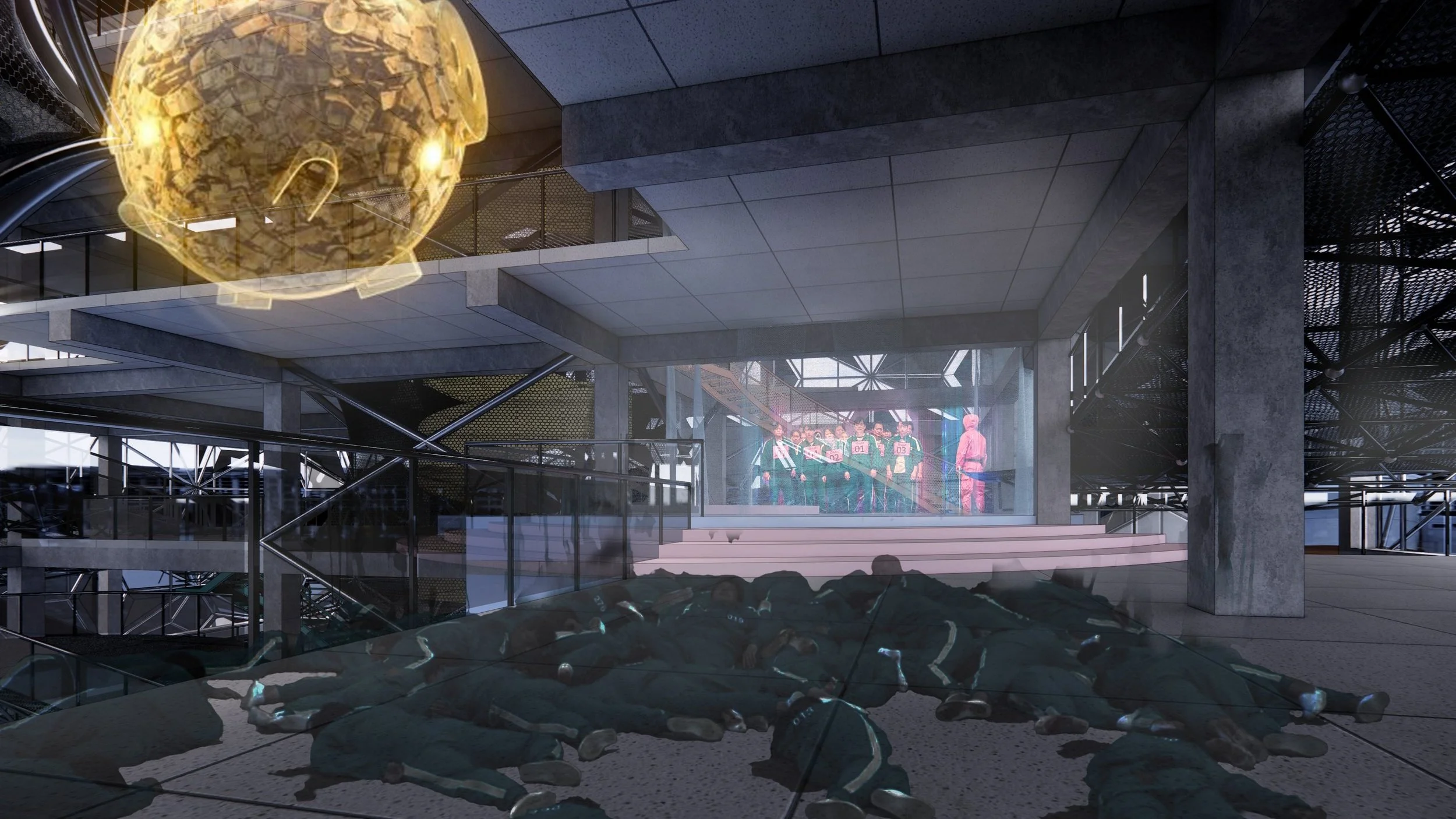 In the 6th Century B.C., ancient Greek city-states set Agora as the assembly for citizens to realize direct democracy. Choosing the site at Athen is to find the loose connection with the glory of the democratic system. Sarcastically, the refugee crisis and government-debt crisis hoist this city with its own petard, so a building for the poor is like a payback. In this project, the sarcasm goes to the extreme by adding the scenes of Squid Game. If the world keeps the same, whether a building can change anything?
